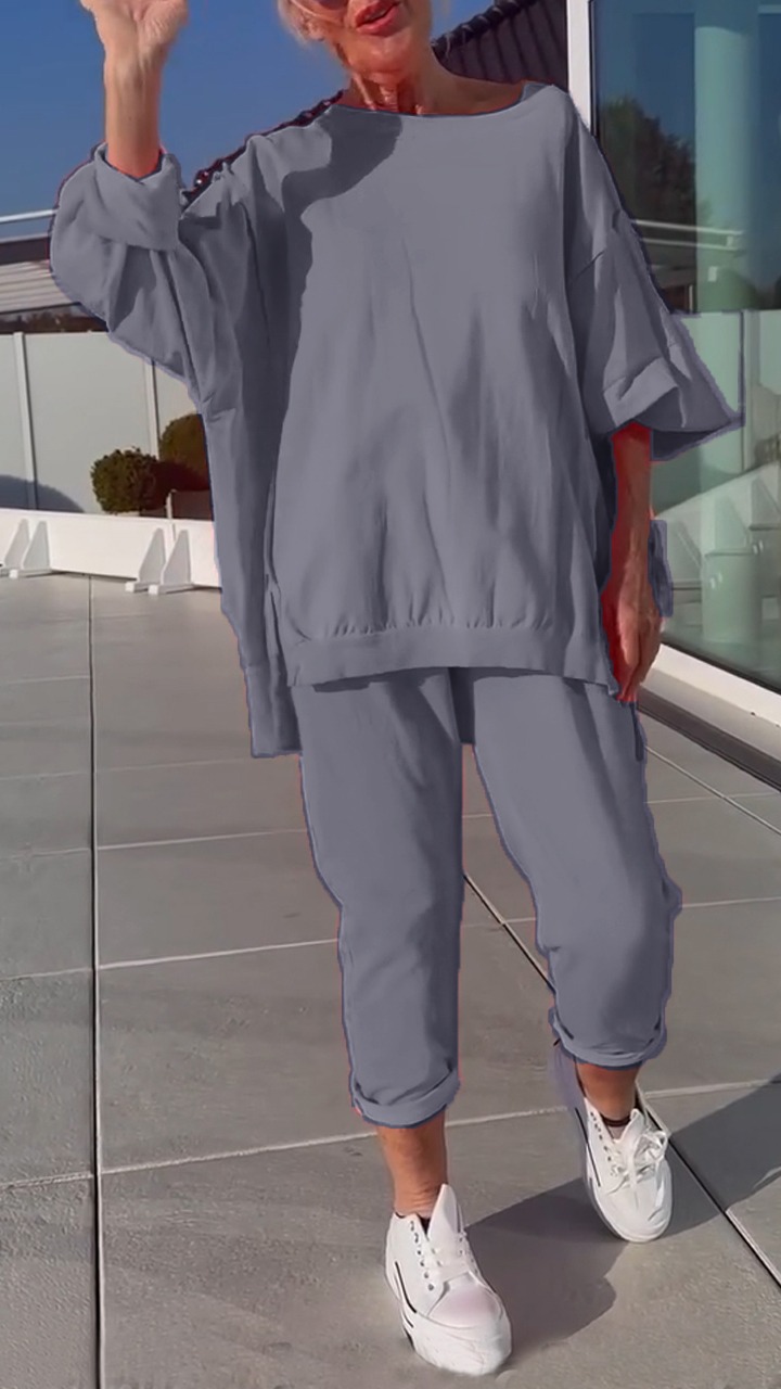 Satin Solid Color Short-sleeved V-neck Top and Elastic Waist Pocket Wide-leg Pants Set