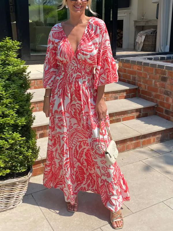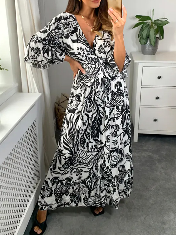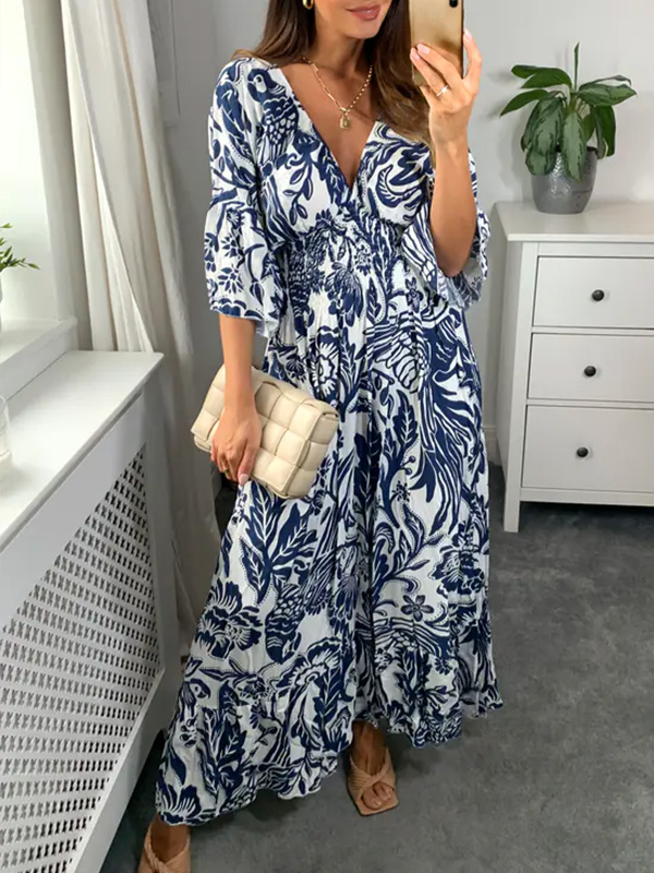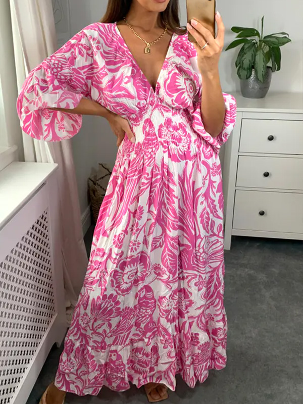 Puffy Sleeve Floral Pattern Elegant Boho Dress