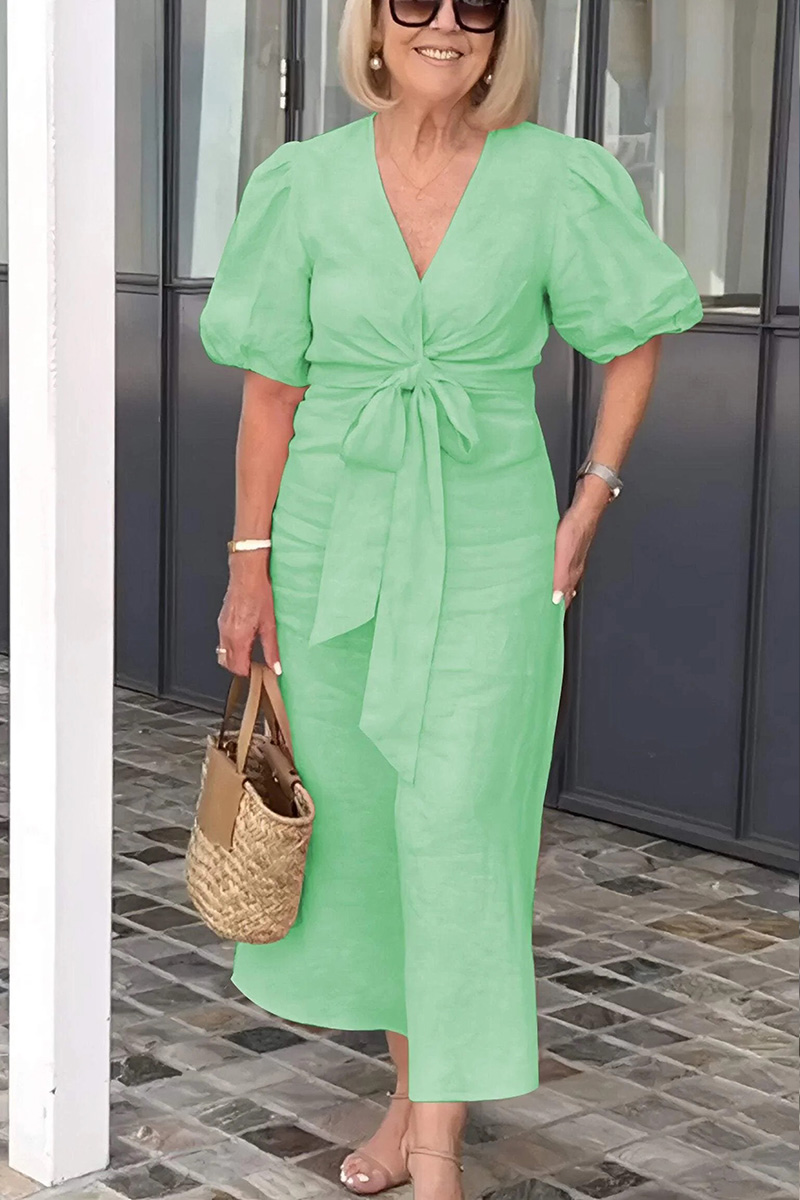 CLEARANCE🔥 V Neck Tie Puff Sleeve Cotton Dress- Tax Free