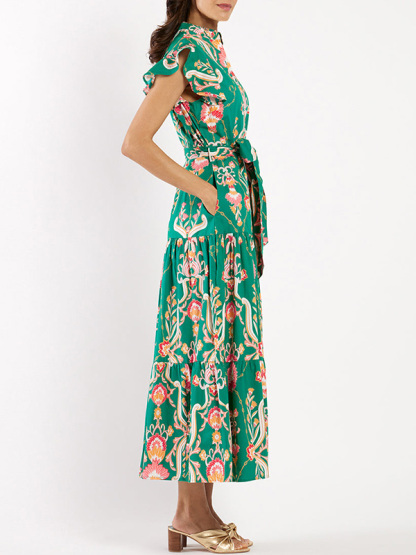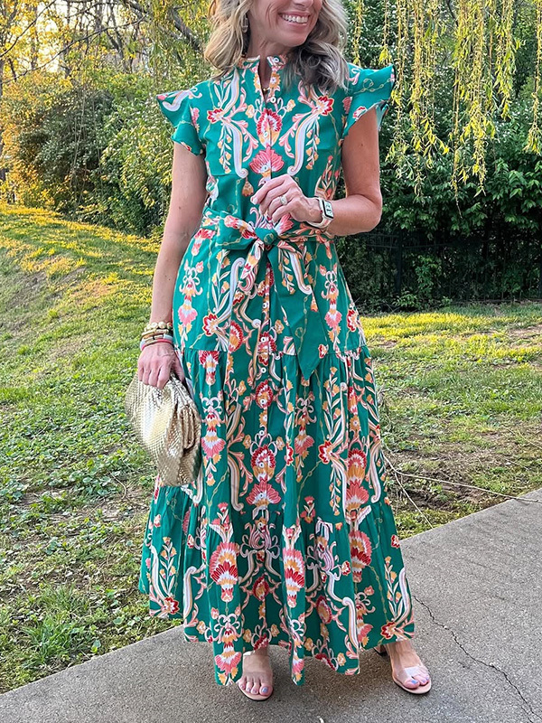 The Ruffle Button Tie Printed Dress is designed for the modern woman who cares about sophistication and style. Printed with a glamorous print and elegant maxi length, this dress is perfect for any occasion.