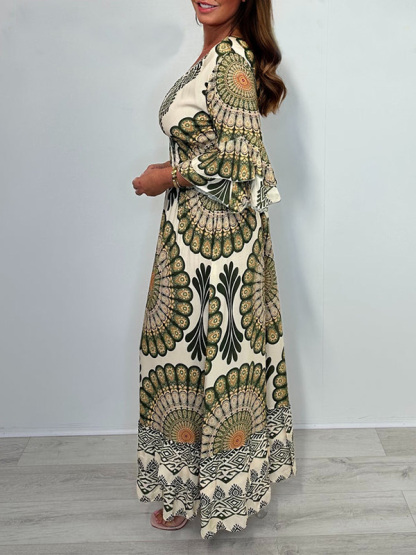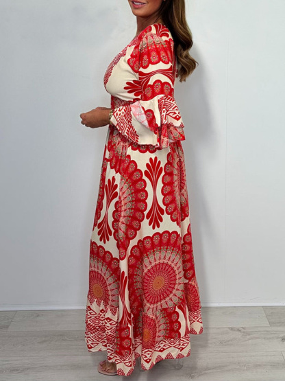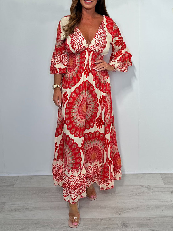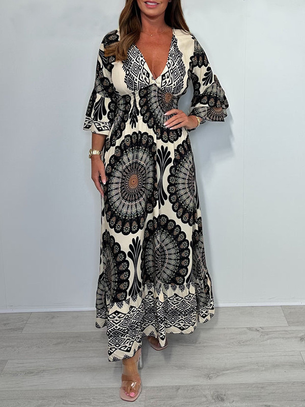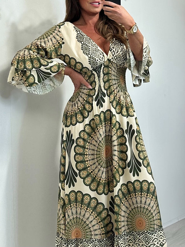 Timeless Elegance: V Neck Printed Flared Sleeve Elastic Waist Dress