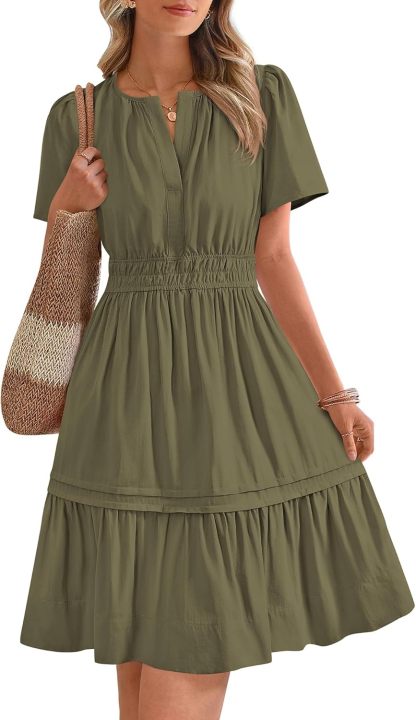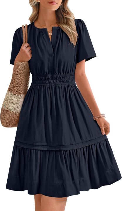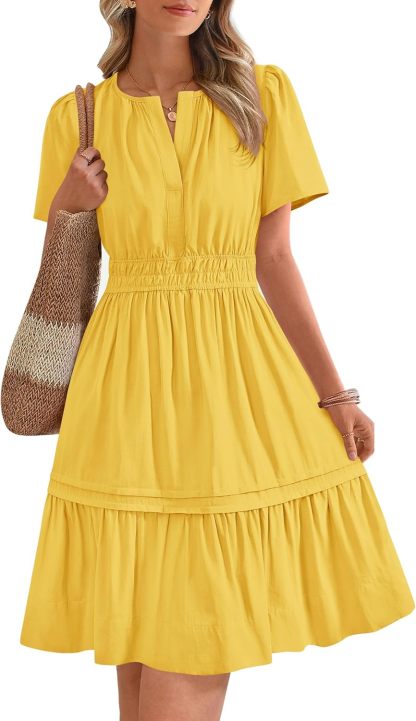 Women's Casual Dresses 2025 Summer Spring V Neck Short Sleeve Sundress Smocked Waist A Line Tiered Mini Dress